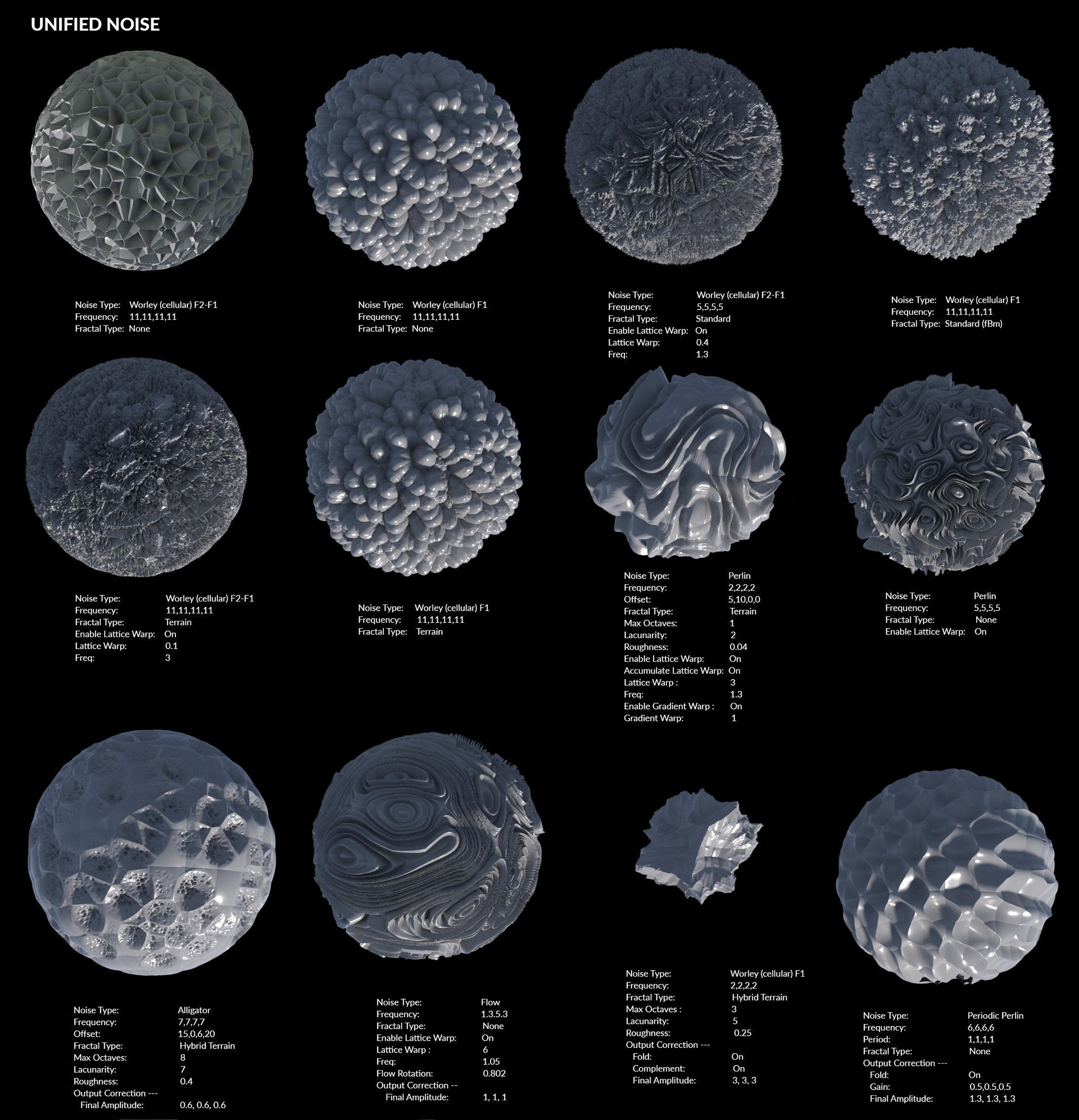 I tested a variety of Unified Noise types to see how they affected the petal displacement. Each noise produced very different surface results — some created bubbly, organic breakup, while others produced sharper crystalline or flowing patterns.